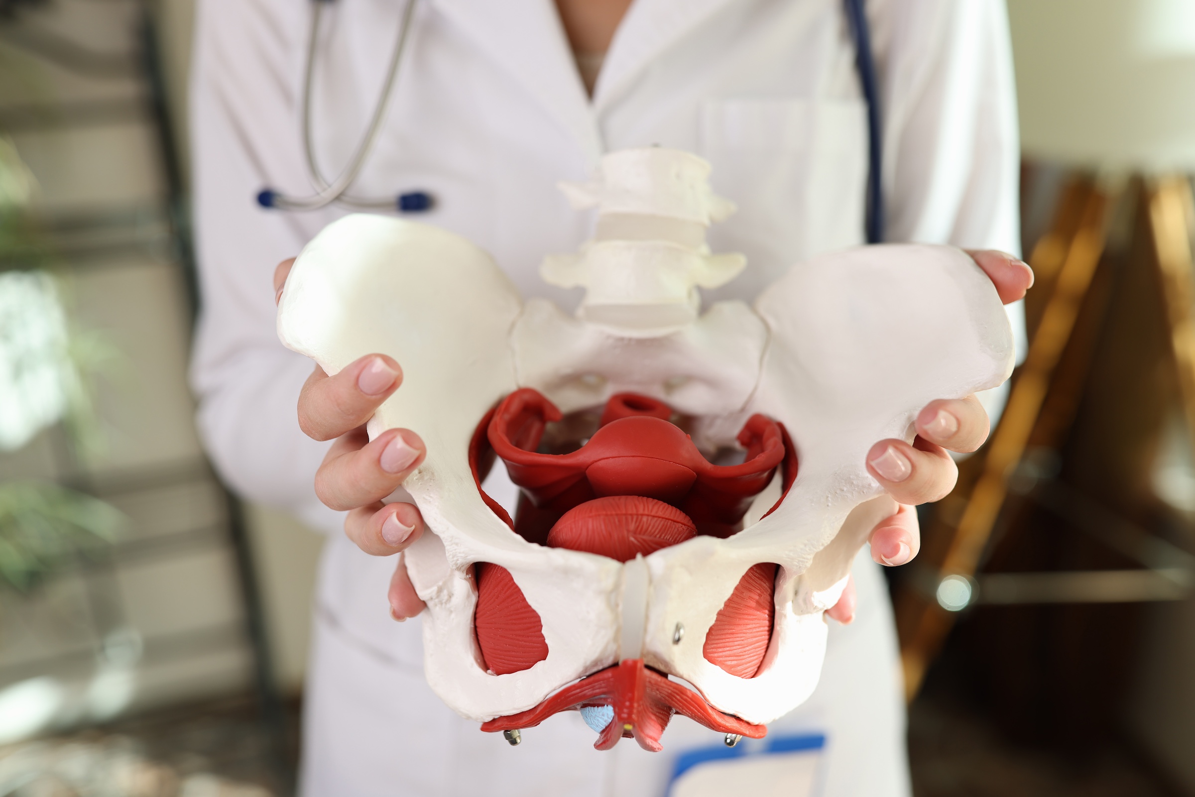 Doctor Gynecologist Holding Of Female Pelvis With Muscles Model