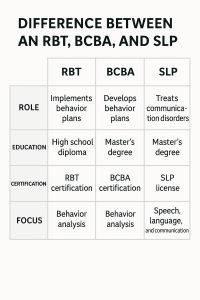 What are the educational difference between a BCBA, RBT, and an SLP?